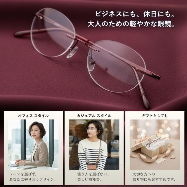 縁無しメガネ 老眼鏡 縁なし レディース ふちなし おすすめ リムレス フレームなし | S・M・Lのフレームサイズ 0.25刻みで選べるレンズ度数 小ぶりボストン/ブルーカラー MIDI ミディ