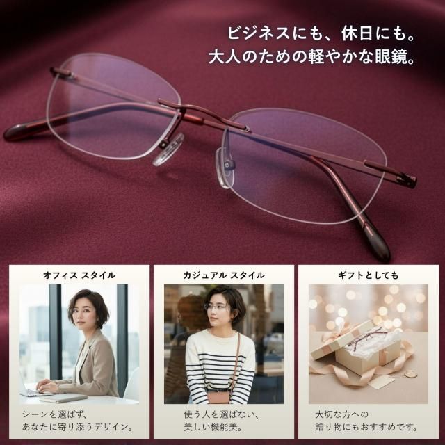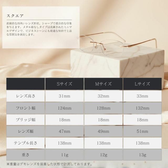 縁無しメガネ 老眼鏡 縁なし レディース ふちなし おすすめ リムレス フレームなし | S・M・Lのフレームサイズ 0.25刻みで選べるレンズ度数 スクエア/ブルーカラー MIDI ミディ