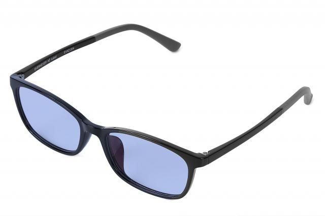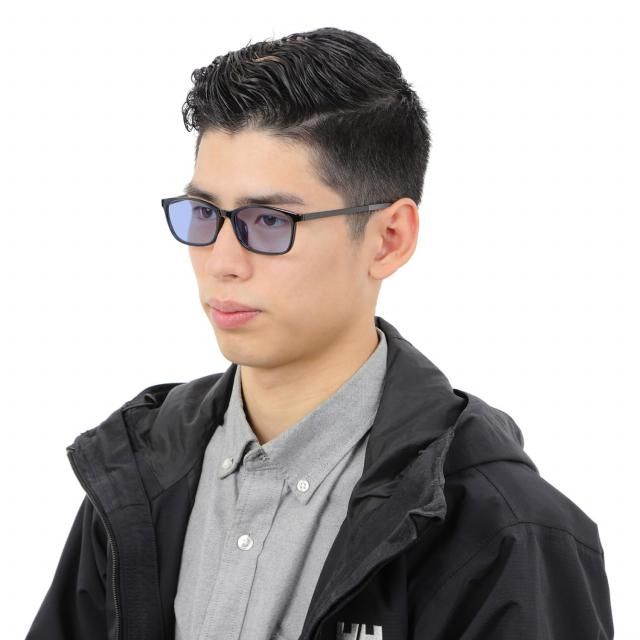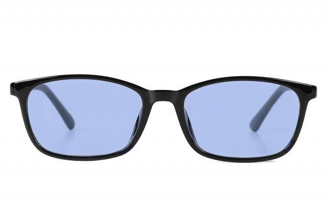 ブラックフレームと落ち着いたブルーレンズの組み合わせで、きれいめカジュアルな装いにも合わせやすいです。